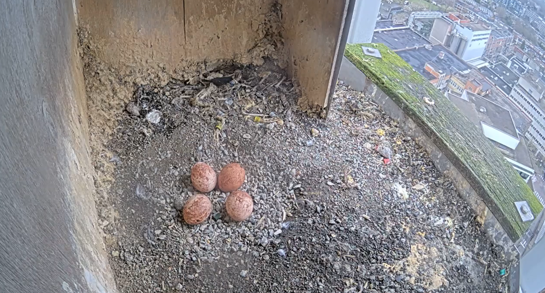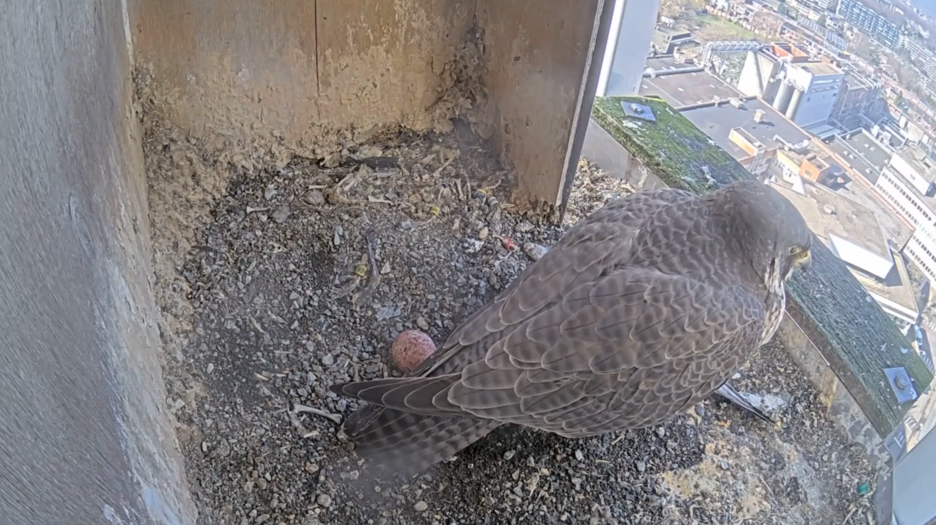 Ben dus daarstraks een kijkje gaan nemen. Bij aankomst zat het mannetje in de kast en een vrouwtje zat op de schouw. Initieel ging ik ervan uit dat dit het vrouwtje was die hier al jaren broedt. Voor alle zekerheid wat beelden gedigiscoped. Als ik die vergelijk met beelden van in het verleden lijkt me dit een ander vrouwtje. Net als het vrouwtje van het koppel draagt deze slechtvalk ook geen ringen. Dat maakte het iets moeilijker om zeker te zijn. De tekening op haar borst is echter anders dan haar voorgangster. Ook haar gedrag op de webcambeelden zijn zeker afwijkend met dat van een broedend vrouwtje. Ik ga er dus vanuit dat het broedend vrouwtje gestorven is! Of deze nieuwe valk daar iets mee te maken heeft blijft de vraag, maar dat is zeker een mogelijkheid.